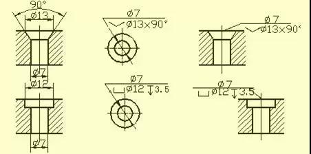 用鉆頭鉆出的盲孔,在底部有一個120°的錐角,鉆孔深度指的是圓柱部分的深度,不包括錐坑。在階梯形鉆孔的過渡處,也存在錐角120°圓臺,其畫法及尺寸注法。
